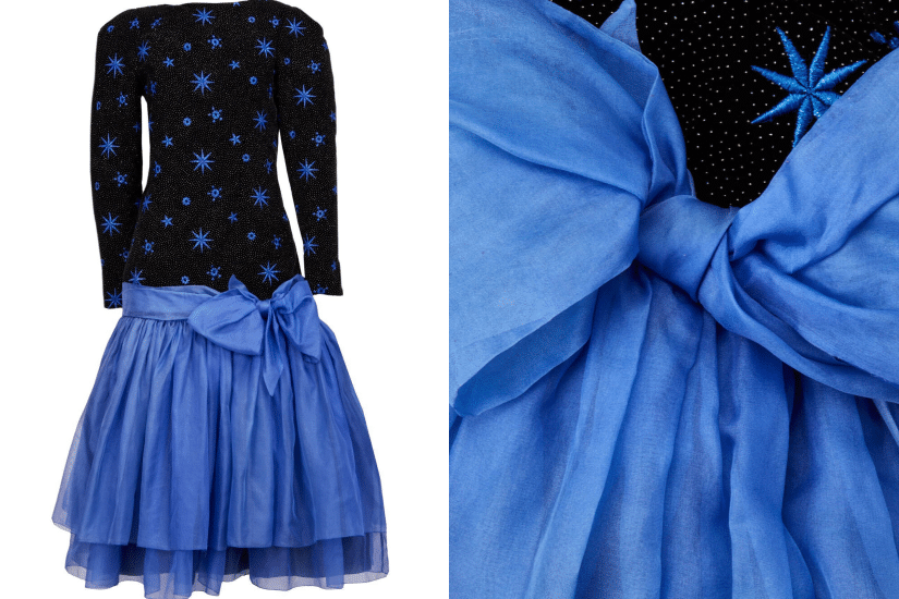 這件芭蕾舞長晚禮服,是由摩洛哥裔英國時裝設計師 Jacques Azagury 為戴安娜王妃於 1985 年 4 月 23 日訪問意大利佛羅倫薩時設計,還附有一幅配套的插圖。晚裝配有帶襯墊的墊肩,黑色天鵝絨緊身胸衣飾有 Jakob Schlaepher 面料製成的金屬線刺繡星星,搭配兩層寶藍色歐根紗半身裙,配有腰帶和蝴蝶結。芭蕾舞裙展現出戴安娜對舞蹈的熱愛,以及她作為英國國家芭蕾舞團贊助人的完美致敬。