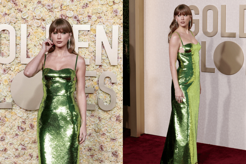 Taylor Swift 一襲 Gucci 訂製綠色亮片禮服亮相,搭配 Christian Louboutin 同色系高踭鞋,加上帶點復古味道的波浪髮型,簡潔卻優雅。