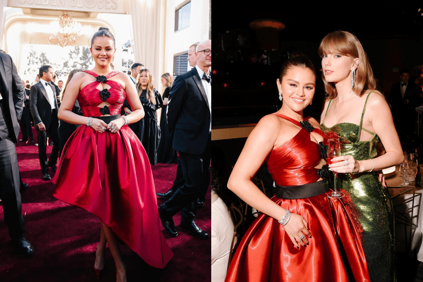 憑《破案三人行》獲提名音樂及喜劇類劇集最佳女主角獎的 Selena Gomez 身穿 Giorgio Armani Privé 訂製紅寶石色禮服,鏤空設計飾有褶皺細節和黑色水晶刺繡花朵,搭配不對稱裙擺,佩戴了 BVLGARI 高級珠寶系列耳環、手鐲、戒指,以及一枚 Serpenti 高級珠寶系列腕錶,為造型錦上添花,性感帶點俏皮。