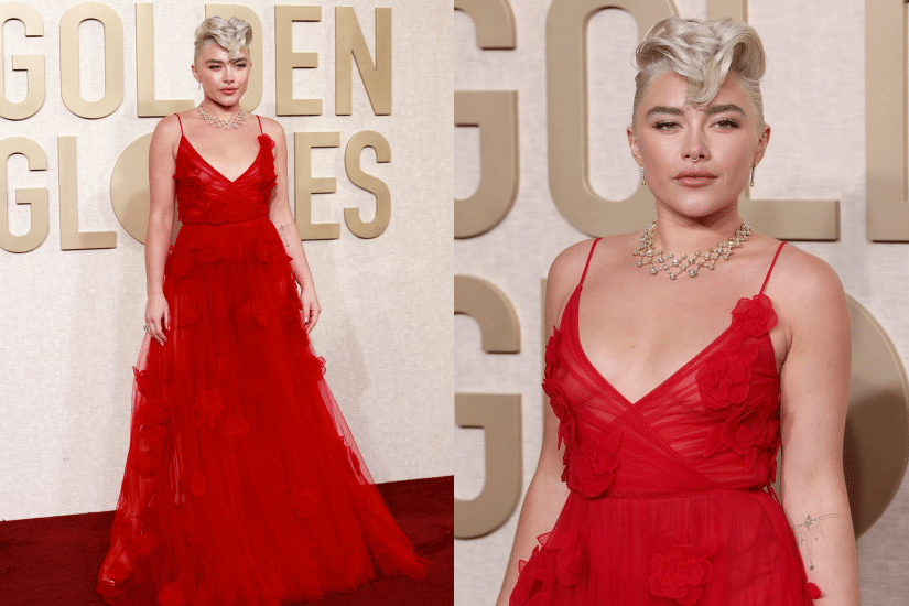 有份參演《奧本海默》的 Florence Pugh 選以一襲 Valentino 豔紅色紗質禮服亮相,裙上飾滿浪漫的玫瑰花瓣細節,並以 Jean Schlumberger by Tiffany 鑽石項鏈及 Tiffany & Co. 的鑽石耳環及戒指為造型華麗昇華,再搭配鼻環造型,凸顯她的大膽個性風格!