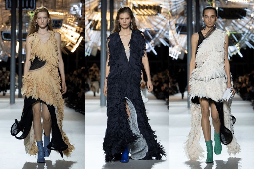 新系列的的造型中,可以看到不少 Nicolas Ghesquière 過往 10 年一直沿用的創作語言,熟悉的早期元素,經典服飾的身影,還有對某個動作、剪裁或刺繡的喜愛,總是蘊藏著一點未來主義,卻不失立體輪廓和隨性垂墜的交織,結合羽毛、金屬色調、亮片刺繡等不同才材質與元素,將一切在想像力之中交融,進行變奏和重塑,打造既熟悉又新鮮的新系列!