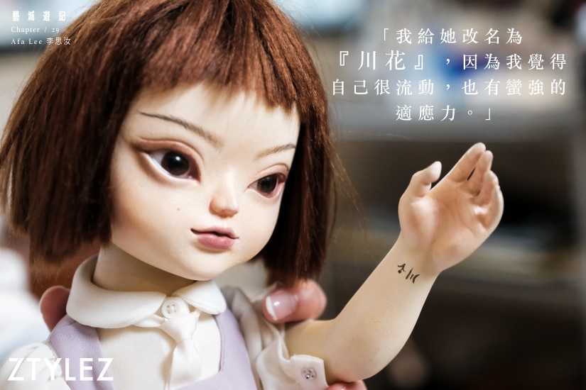 就在她介紹之時,讓人愈發覺得「川花」與 Afa 極為神似,連名字也如是。Afa 說自己的英名名字是取自「阿花」的 Chin-lish 譯音,而玩偶的名字也有「花」,身上還刻有名字的紋身。