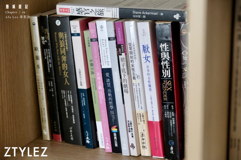 女性、本能、生死甚至是鬼怪,都是她筆下常見的主題,這也是在她的工作室書櫃裡分門別類地擺放的書籍。而當中最喜歡的一本,叫《感官之旅》,是一本解構五官知覺的起源、發展及自然歷史知識。