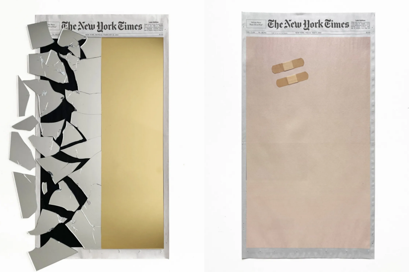 其實涉谷翔的靈感不僅僅是漸層色彩的日出,還曾在「頭版作品」上畫過日常生活,反映政治以及社會現況的創作,如美國開始接種 COVID-19 疫苗時,涉谷翔便畫了兩塊 OK 繃;在電子音樂團體傻瓜龐克(Daft Punk)宣布解散那天,涉谷翔更了用了半面破碎的鏡子搭配金色,向其致敬。