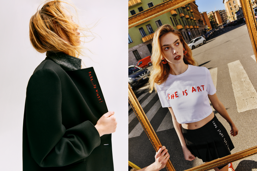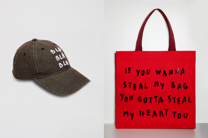 看似正式的西裝背後印上了「 Out of Office」字樣,為嚴謹的配搭增添輕鬆與玩味;外套不經意處融入的「 Brr So Windy」元素,將內心私語化為時尚表達;而長款拼接針織開襟衫上醒目的 「 Don’t Be Squared」標語,則彰顯出打破陳規追求個性的自由態度,還有飾上標語塗鴉、口號或迷因句式的 T-Shirt、裙子、襯衫和手提包等單品。