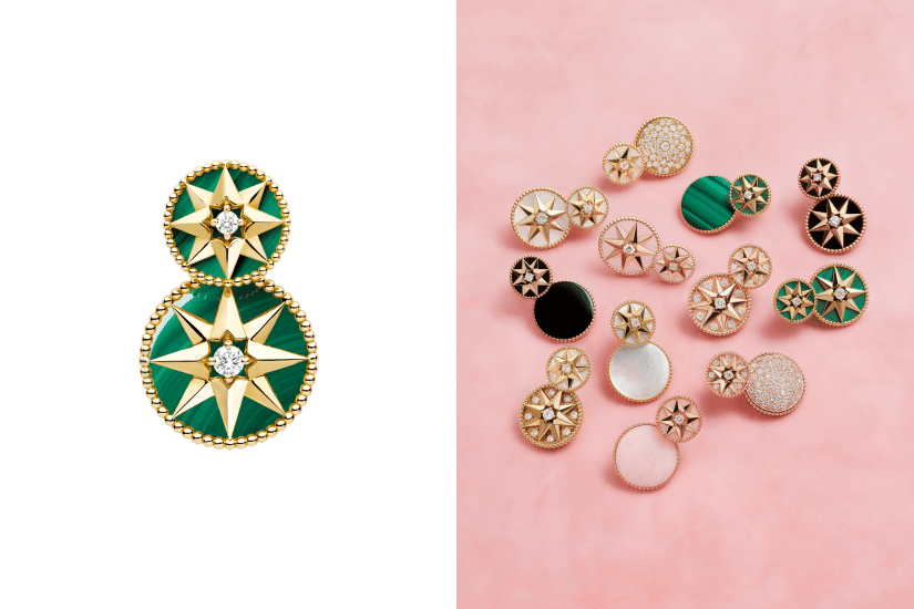 這次的 Dior Rose des Vents 系列全新款式,自然也延續了經典的羅盤玫瑰和八角星之招牌設計,展現出無與倫比的巧思和藝術美感。 Rose des Vents Tribale 耳環由飾以羅盤玫瑰的圓盤,與鑲嵌裝飾寶石或密鑲鑽石的雙面圖案的吊墜組成,備有黃金或玫瑰金款式。既可單獨或成雙佩戴,配搭同款或不對稱設計,為每位佩戴者塑造獨特的造型。
