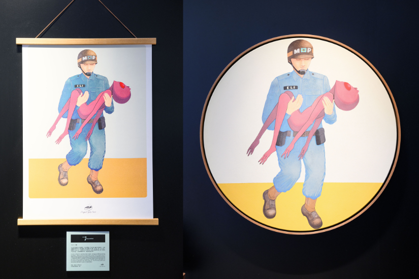 庭:另一幅也是取自一個真實故事 —— 在一九八幾年的巴西發生了一件 UFO 事件,震驚全國。因為有一架 UFO 掉了下來,有幾個類似外星人的生物走進城市內,許多居民見到都驚慌地致電軍方或警察局報案。而畫中的主角是一名叫「 Eli」的軍警,他剛好開車經過見到其中一個外星人,他徒手便把他抓上警車、送去醫院。但三個星期後,他因為感染了不知名細菌而死亡;另外還有一個外星人被一眾消防員抓到,但最後外星人都死了。這件事因當中涉及的人眾多,所以很出名,而我就用這個作品去紀念他們。