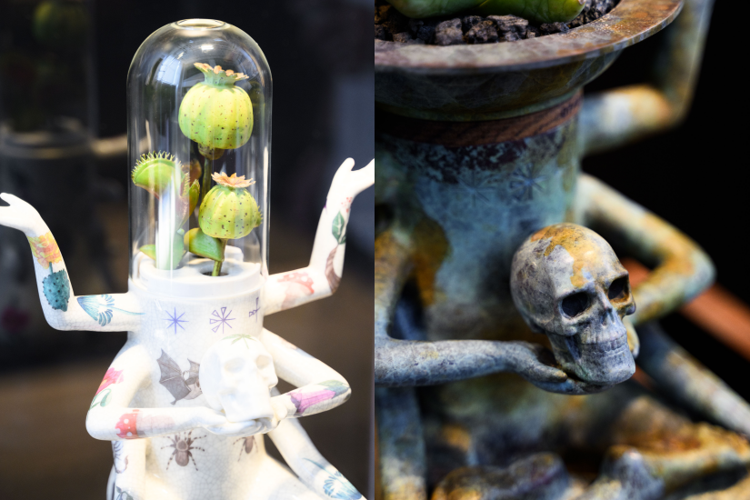 當中有聯乘 Prodip 的塊根植物品牌 Plants of Gods 所推出的植物藝術容器,包括 Hallucination Tattoo 冰裂 紋陶瓷版。冰裂紋陶瓷製作歷時一年多,從設計、模具、製漿、配釉、燒製以 28 道工序,經過多次試驗 最後生成極其珍貴的 100 套合規格成品。另一款是銅鏽版,經 13 道工序,限量 25 個並以不同種類的銅及氧化效果製作,每一個陶瓷都是獨一無二的收藏品,在疊層氧化下形成一種自然美。