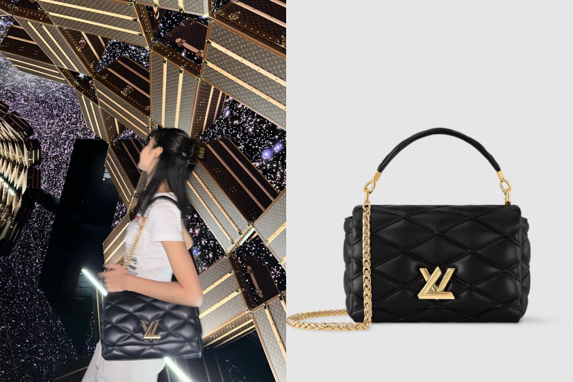 Lisa 以休閒輕便的裝扮,搭配 GO-14 手袋。這款手袋以柔軟奢華的小羊皮製作,綴有為品牌經典硬箱所設計的標誌性絎縫圖案,其閃爍的金色 LV Twist 轉鎖是重點細節,奢華而細膩。
