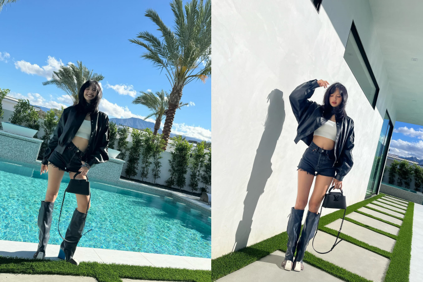 在加州以觀看 Coachalle 演出,Lisa 身穿白色 crop top 搭配皮褸、黑色超短牛仔褲及長靴,搭配全黑色的 Capucines 手袋,性感又型格!