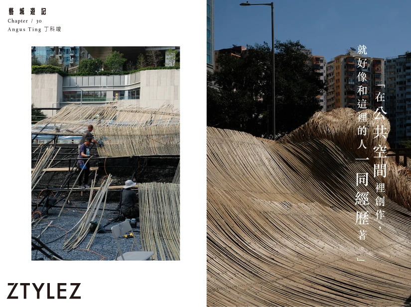 而當中最使他深刻的,就是近日座落於觀塘的創作〈浪.岸〉。「這是與市建局合作的公共空間藝術裝置,因為暫時未能發展該地,市建局便讓不同的團體或創作人去製作一些與觀塘有連繫的裝置藝術作過渡,而我是其中之一。因為這作品就在裕民坊,屬於較複雜的地理環境,所以爭議很大;而作品既要符合地形、客戶的想像外,還要考慮不同的人對於這個空間的未來發展想像,以及自己的一些思考。所以我大規模地用竹,以重複性創作出一片海浪,希望能讓別人在這過渡空間中有不同的聯想。」