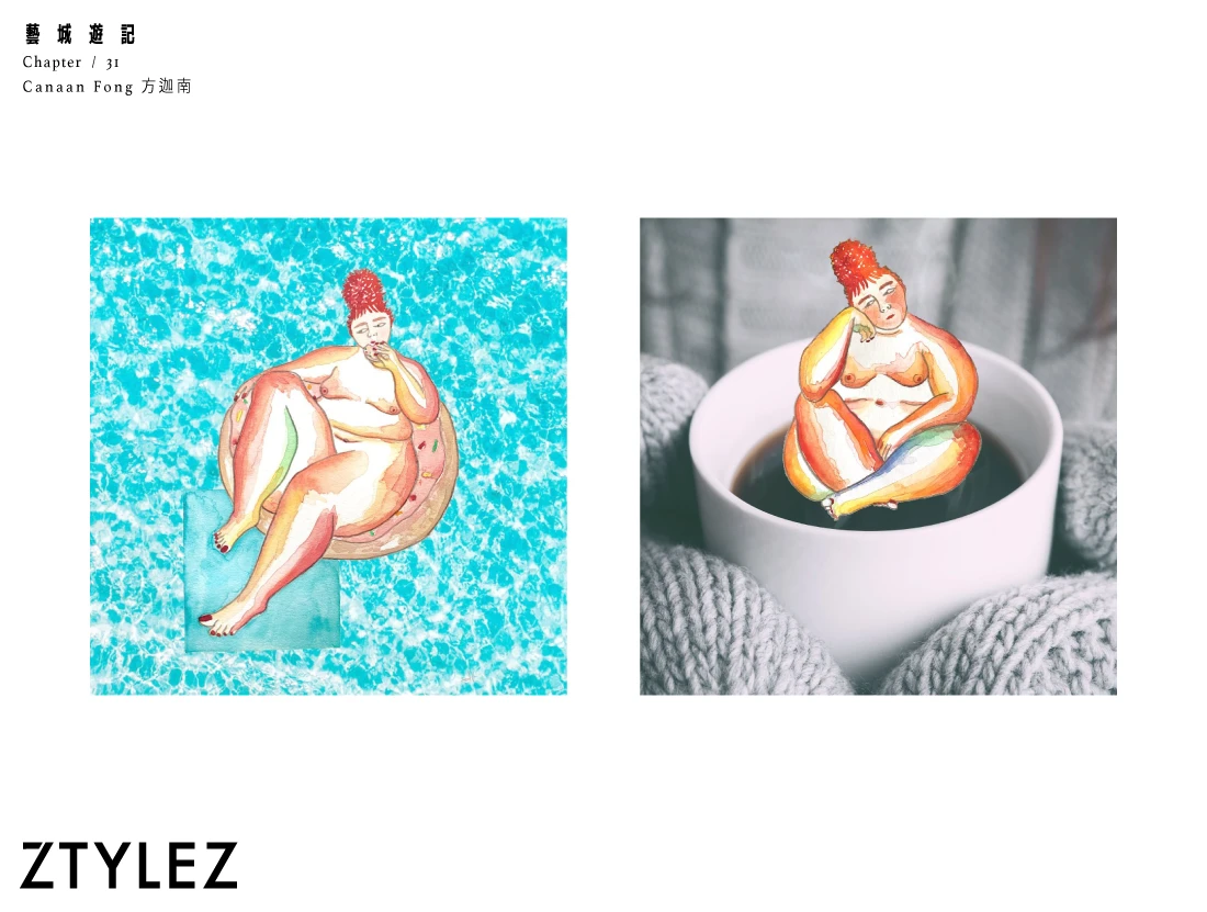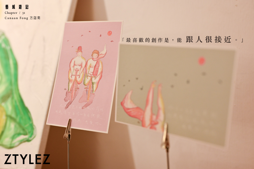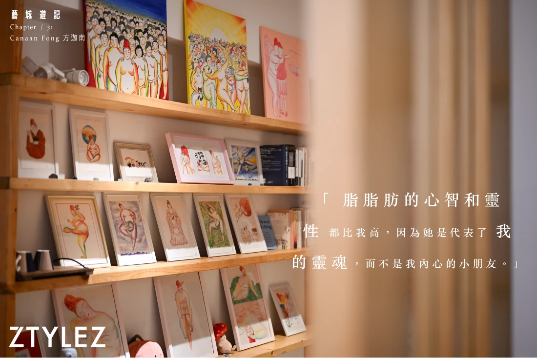 Canaan 回想自己的創作之路,從自學繪畫到踏入創作,更像是從抗衡變成釋放自我的修行。四年來,從第一個「脂脂肪」、展覽、繪本、自創的「脂心卡」到最新的畫作〈轉化〉,每步都是順其自然之作。「其實我的創作過程,就是專注感受生活中的每個直覺。」