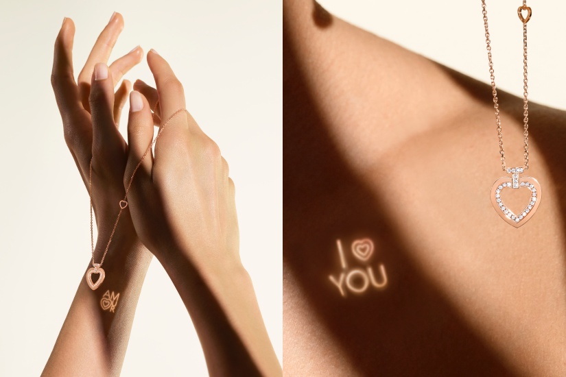 Fred將這項創新且獨家技術運用在這5款全新的項鏈上,每款項鏈皆飾有玫瑰金心型圖案,並鑲嵌了不同鑽石,每條項鏈都隱藏著一段密語。在每個吊墜的背面均隱藏著一個獨特的訊息、傳遞著愛意。這段密語只會在佩戴者想看時才會被揭示和與人分享。只有當光影照射到珠寶的這一面時,這些句子與符號才會像太陽在海上反射倒影的效果般揭示出來。