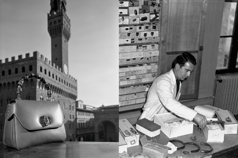 1947 年正值意大利戰後傳統原材料匾乏的年代,佛羅倫斯工匠協助下,品牌創辦人 Guccio Gucci 決定大膽以輕巧耐用的竹枝作為手袋手挽,以對比設計打破當時的美學法則。每枝手柄由挑選竹子,到塑形都需要繁複的製作工序,每枝手柄均獨一無二。