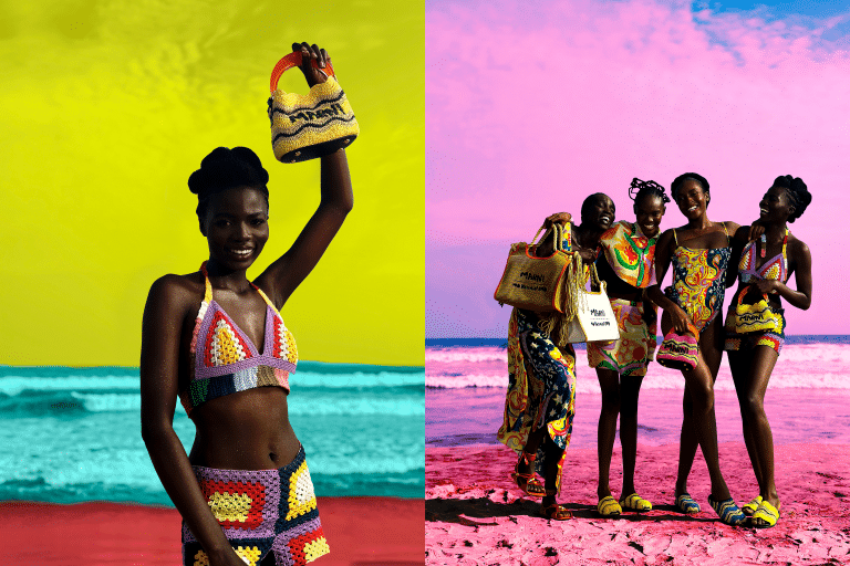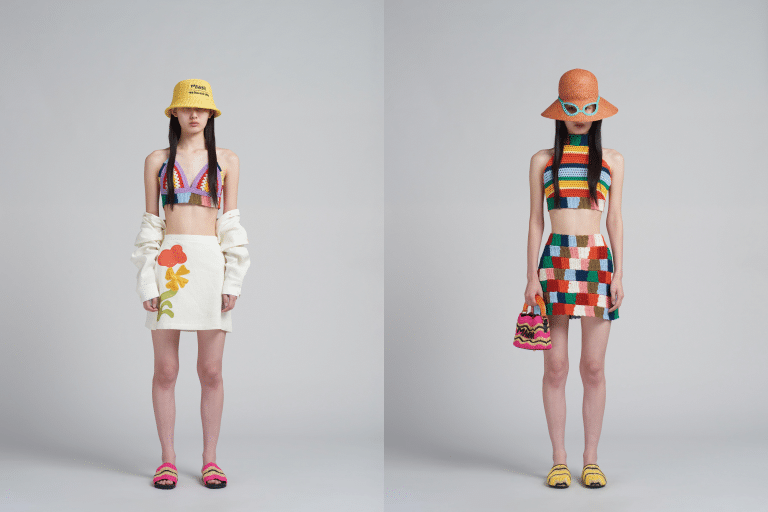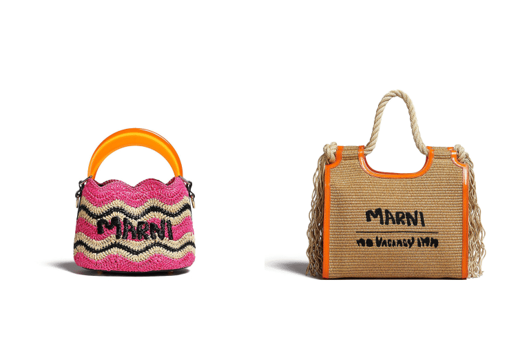 另外又將 Marni 經典手袋重新演繹 ,拉菲草編織款 Venice 迷你水桶包和 Marcel 手袋,搭配撞色皮革飾邊與做舊草編手挽。該系列還推出 Fussbett 針織拖鞋、皮革羅馬涼鞋與飾有雲朵和鳥兒圖案的 Dada Bumper 白色休閒鞋,以及拉菲草帽、漁夫帽等配飾,變幻斑斕色彩。