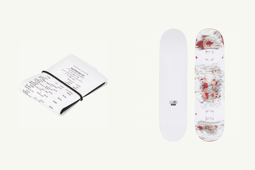 Supreme x MM6 全新聯名系列,包括人造毛皮大衣、校園風外套克、工裝外套、水洗棉西裝和背心、襯衫、潑漆連帽運動衫、潑漆牛仔褲等,結合了 MM6 擅長的解構、前衛作風。此外還有小物配件,如銀包、Kryptonite 鏈條、帽子、滑板、襪子等單品,其中以 Supreme發票包覆 Maison Margiela 錢包的設計相當有趣吸睛!