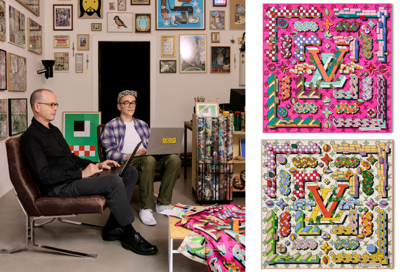 德國像素藝術組合eBoy的「Maze of Precious」方巾,以鮮明的像素風格將LV標誌置於迷宮中央,迷宮邊界由Monogram圖案、繽紛植物和幾何昆蟲組成,充滿趣味與細節,讓人目不暇給。