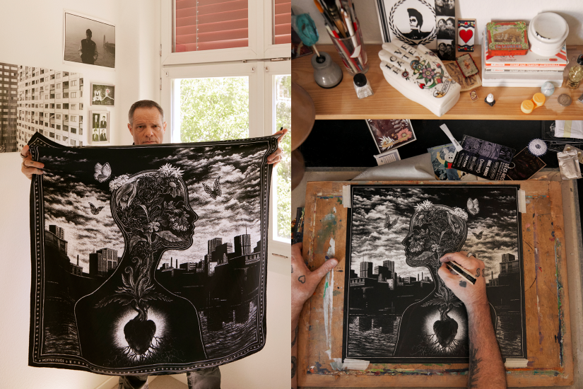 瑞士藝術家Thomas Ott,曾創作《The Number 73304-23-4153-6-96-8》獵奇小説,運用黑白刮板技術,透過黑白對比的視覺衝擊描述故事。在「Urban Flowers」方巾中同樣運用該個技術創作,展現了自然與城市的對抗與融合,花朵成為人類精神的象徵,圖案細膩且充滿張力,令人深思。