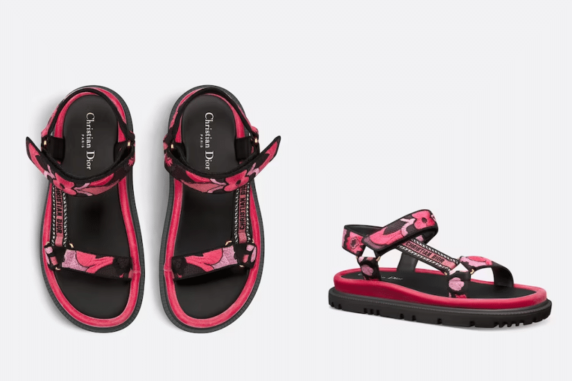 Dior D-Wave 涼鞋以現代美學凸顯混合風格。胭脂粉色羊皮搭帶,側面綴飾金色色調 Christian Dior Paris 標誌,選用超輕盈和舒適的 EVA 切口鞋底,為任何造型增添時尚魅力。喜歡搶眼設計,可以考慮另一款 Indy 粉紅色棉搭帶設計,綴以 Jardin Indien 主題圖案刺繡,以明亮的色彩彰顯印度植物的魅力。