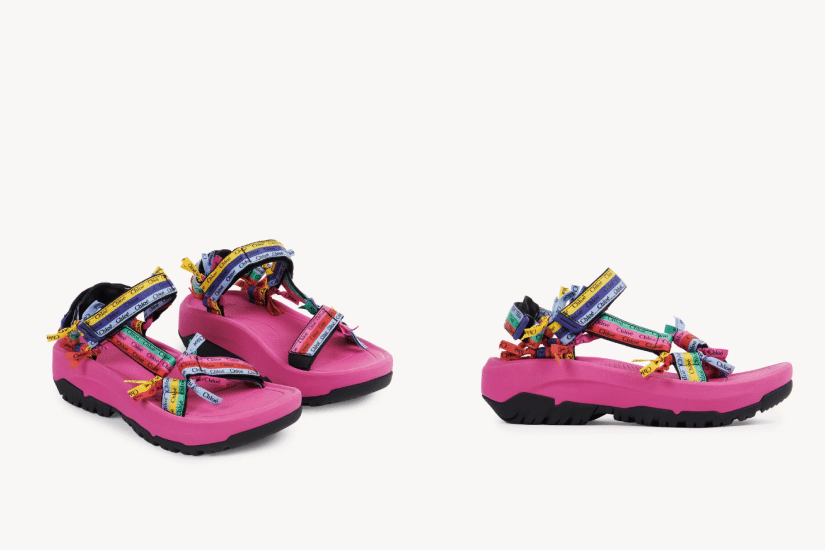 說到貼帶涼鞋,當然不得不提美國戶外品牌 TEVA,它設計出世界上第一雙戶外涼鞋,而貼帶設計的 Hurricane XLT2 正是品牌的經典鞋款。今年夏季 Chloé 與 Teva 合作,帶來這款彩虹粉色 Hurricane XLT2 涼鞋,非常搶眼俏皮。
