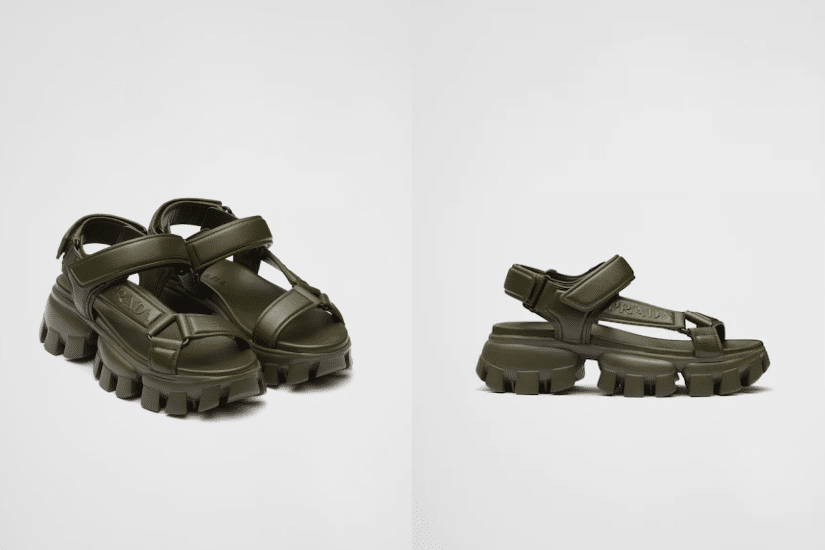這雙 Prada 皮革涼鞋靈感來自運動世界,設計呈現強烈的視覺效果。鞋面配以魔術貼搭帶,橫坑紋厚鞋底混合不同物料及細節,散發復古氣息。