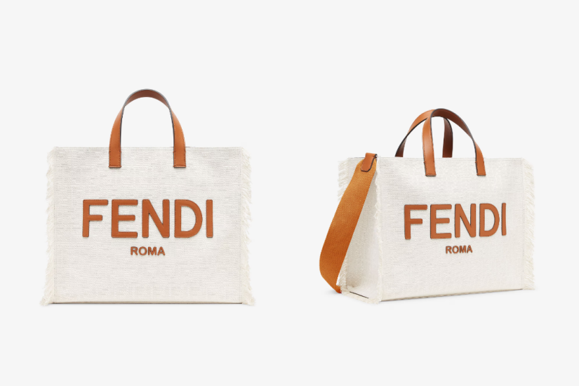 以白色 FF 提花製成的大型款式手提袋,袋面綴有棕色皮革 FENDI Roma 字樣,側邊搭配手工製作流蘇,充滿著休閒度假氣息,附有棕色皮革雙手柄和可拆式帆布肩帶,令使用法式更靈活多變。