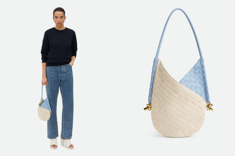 Bottega Veneta 這個全新袋款,為品牌標誌性的Intrecciato織皮工藝帶來了新鮮感,設計給合了帆布與皮革,再以精緻金屬扭結細節點綴,加上清新柔和的粉藍調子,讓人一見心動。