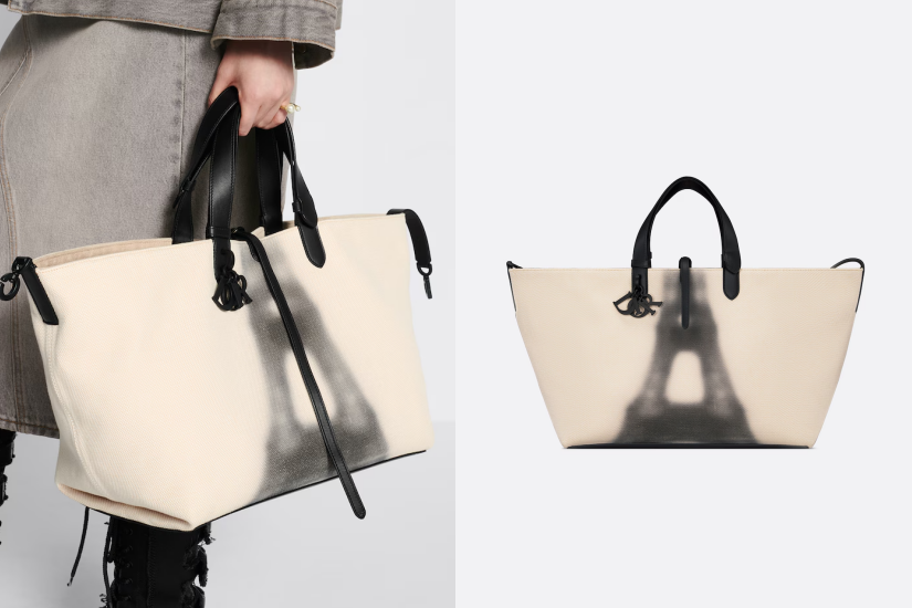 Dior Toujours 手袋以休閒而實用的設計為特色,以奶白色帆布製造,綴以迷人的艾菲爾鐵塔造型,靈感來自 Brigitte Niedermair 為 Dior 拍攝的照片。絨面小牛皮內層設計寬敞,更貼心配有 1 個同款化妝袋。幼身皮革搭帶開合可妥善保存物品,而 CD Lock 鎖扣的 D 字可調校兩側,令手袋造型更添魅力。