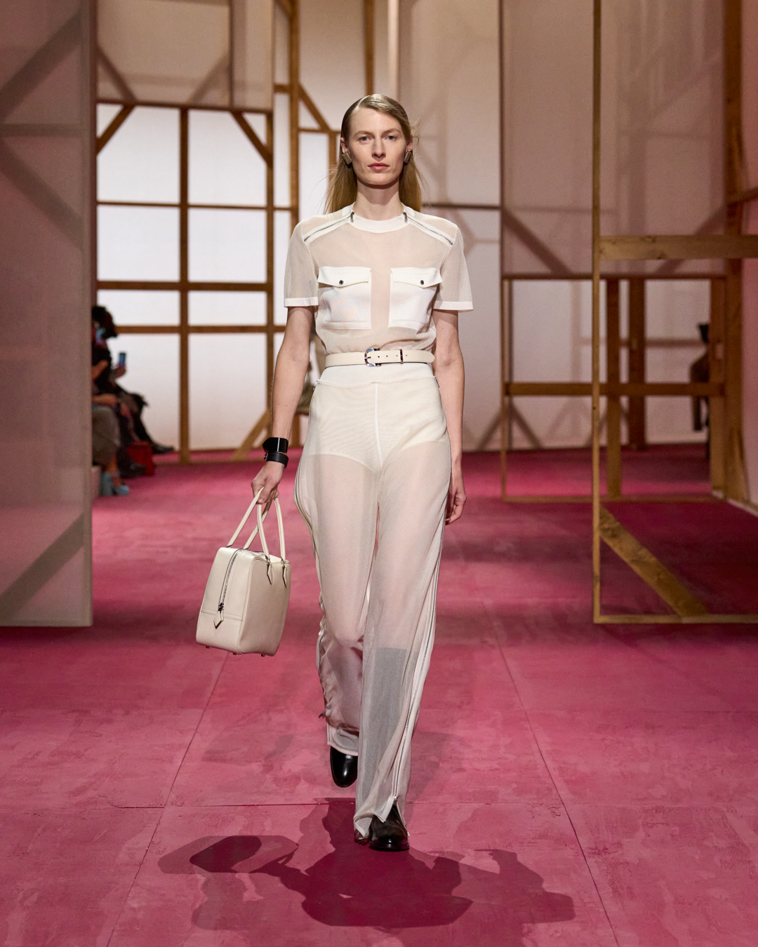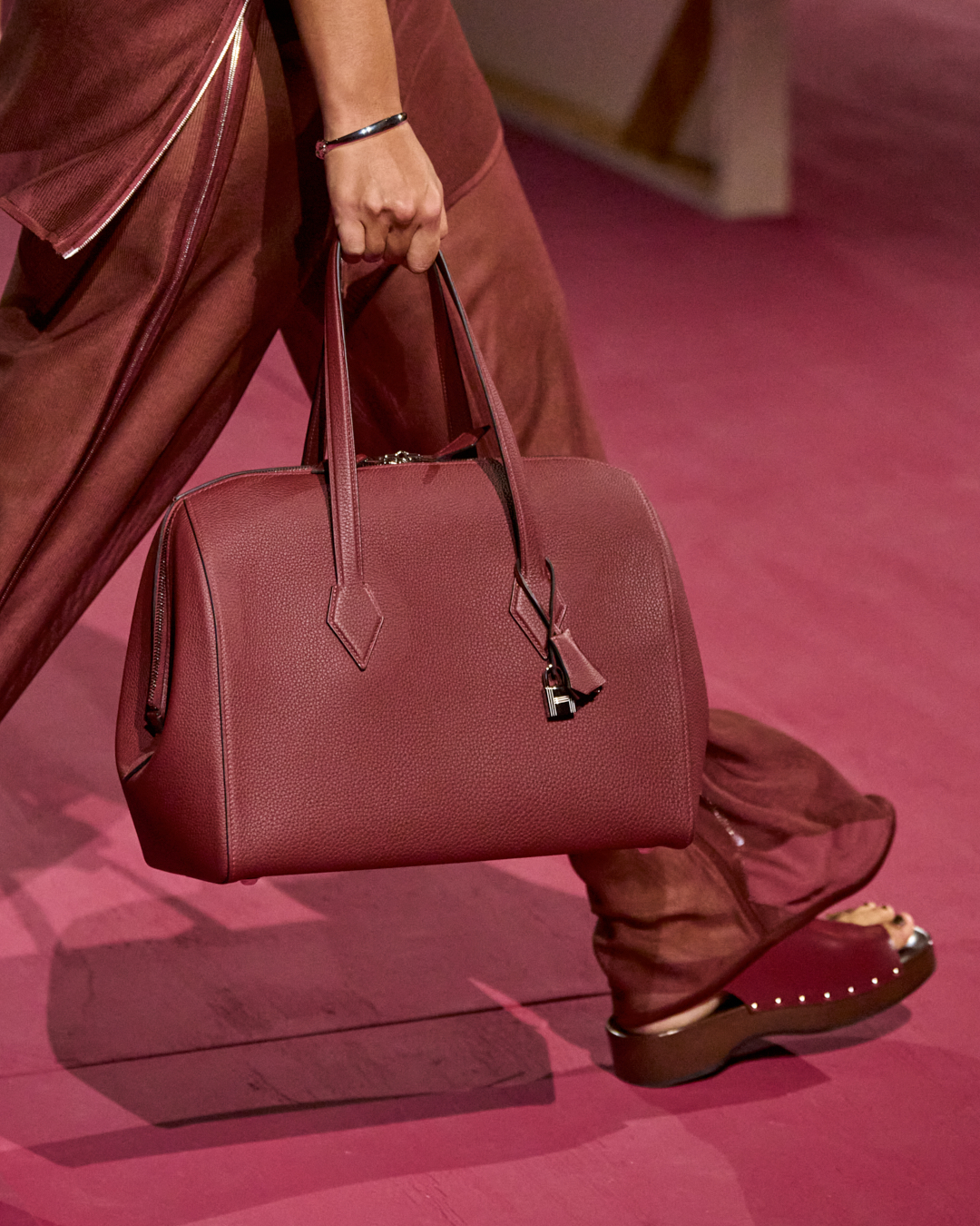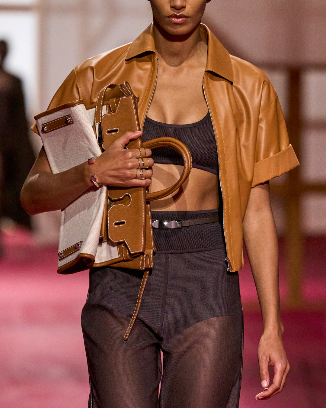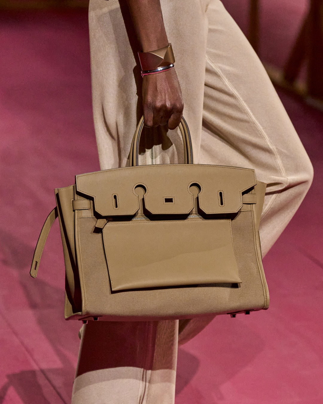 而在這系列中,fashion insider 或是品牌愛好者最心心眼的一定是各種愛馬仕手袋。在這一季中,Nadège Vanhée 把 Hermès 經典的 Birkin「壓縮」,或是裡外顛倒的「inside-out」,打造截然不同的風格。