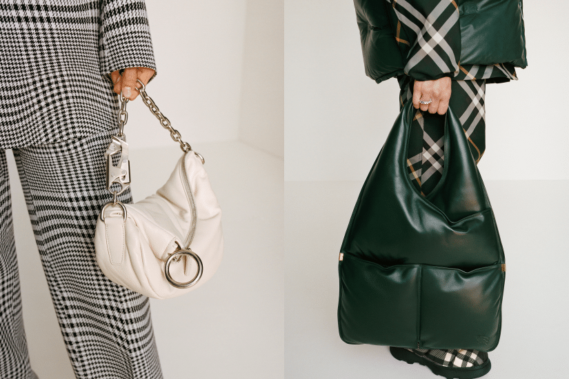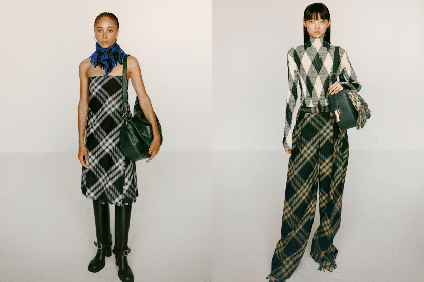 手袋配飾向來是 Daniel Lee 的拿手好戲,這次亦成為新系列的亮點,不少造型均戴着飾有流蘇,以格紋羊絨打造的 Happy 圍巾。騎士包系列以韁繩馬夾為特色,還有以蓬鬆皮革設計及羊毛皮製成的新款水桶包,又採用皺褶皮革或威爾斯格紋提花推出兩款單肩包;菱格皮革托特包則結合騎士圖案壓紋細節全新呈現。此外,皮革圓筒包及帶有衣夾扣的 Burberry 格紋編織 Peg 包也同時亮相。