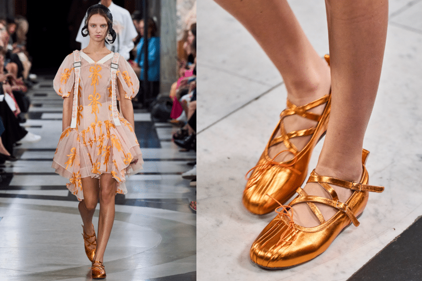 芭蕾舞鞋設計輕便舒適,而且百搭易襯,既可以甜美,又可以穿出個性,是女生鞋櫃必備的平底鞋款。芭蕾舞鞋更成為 2023 春夏鞋款潮流之一,多個品牌的時尚秀上也可以看見其蹤影, Simone Rocha 推出金屬版本,加上搭帶設計,甜美卻多點前衛氣息;MM6 Maison Margiela 靈感來自芭蕾舞者的鞋,男模特兒一樣演繹得入型入格; Tod’s 則為經典 Gommino 豆豆鞋帶來芭蕾舞鞋變奏。