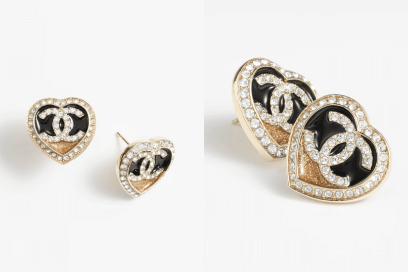 Chanel 的 CC Logo 經典又具標誌性,就是有著一種讓人難以抵擋的魅力。此款耳環透過黑色與金粉的愛心造型襯托中心的 CC Logo,再以水晶作點綴,呈現摩登復古的型梧格效果。同款設計還有戒指款式選擇。