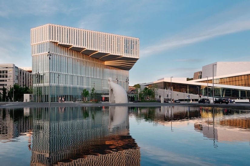 位於濱海的 Deichman Bjørvika 毗鄰歌劇院與中央車站,遠處看過去有浮於水面的感覺。圖書館由設計師 Atelier Oslo 及 LundHagem 所操刀,共有 6 層,約有 1.45 萬平方英尺,採用北歐簡約風設計,揉合折疊式幾何結構,外型獨特。