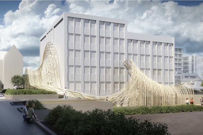 同樣出自隈研吾的設計!日本關東「角川武藏野博物館」集合圖書館、美術館與博物館於一身,其外型設計由多達 20,000 片不同色澤的花崗岩所砌成,打造出有如巨型石頭般的不規則多面體。走進其中,視覺效果同樣震撼!