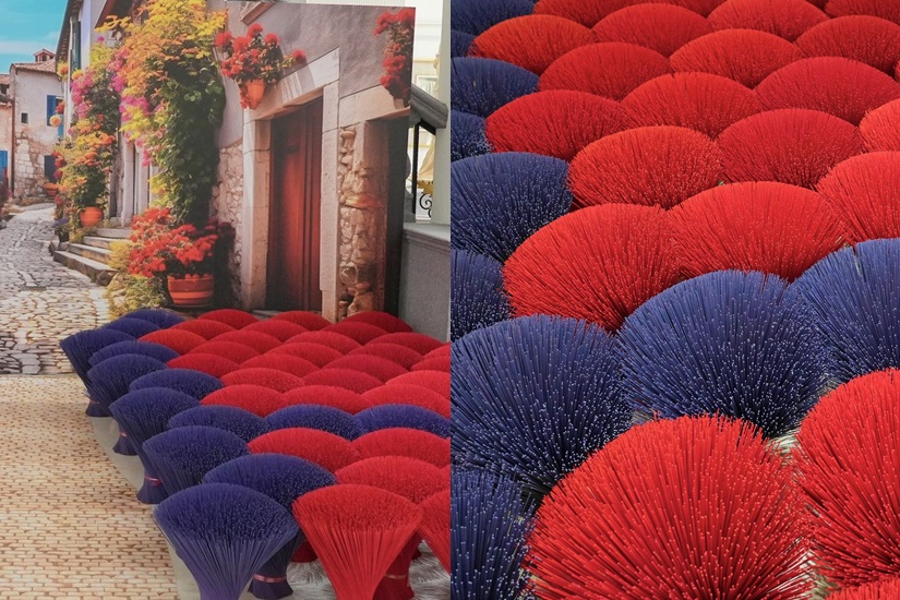 此外,佐登妮絲城堡還有與香藝文化園區「新港香藝」聯手打造,於美研所旁邊飾上紅色與紫色的「香藝波波草」,是由一根根香腳簇擁而成的球狀造景,融入歐式風格街道,相當搶眼!